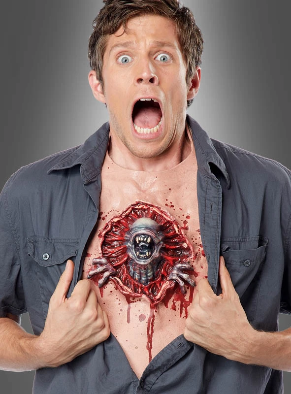 Vorsicht, bissiger Alien. Hier will sich ein Außerirdischer den Weg in die Freiheit bahnen – durch Ihre Brust! Mit diesem tollen Accessoire schocken Sie garantiert jeden auf der nächsten Halloweenparty, denn dies ist ganz bestimmt keine alltägliche Verkleidung.
