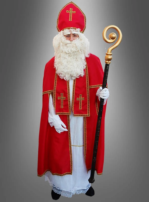 Darüber trägt der heilige Bischof einen weiten, roten Umhang. Er wird mit einem breiten Riegel Stoff auf der Brust durch Klettband verschlossen. Ansonsten ist er weit offen und lässt den Blick auf das weiße Untergewand frei. Der Umhang hat vorne auf beiden Seiten kurze Schlitze eingenäht, durch die man die Hände stecken kann um den Segen zu erteilen. Am Cape angenäht ist ein kurzer aber weiter Schulterumhang. Alle Säume und auch die Schlitze für die Hände sind mit goldener Borte wertvoll verziert. Die Mitra – die typische Bischofsmütze – und der daran angenähte Stola Schal sind ebenfalls dabei. Auch die Mütze und die Stola sind reich mit goldener Borte bestückt.