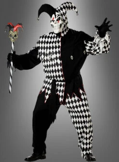 Mit diesem Narr ist nicht zu spaßen. Er versucht erst gar nicht seine fiesen Absichten zu verbergen, sondern grinst hämisch vor sich hin. Das ideale XXL Kostüm für eine gruselige Mottoparty oder zu Halloween, aber auch für Black and White Partys.