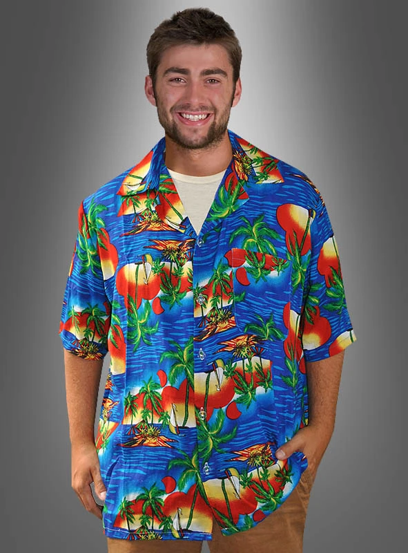 Hawaii Hemd in blau mit schönem bunten Insel- und Palmenmuster. Sonnenuntergangsromantik pur! Das Hemd hat einen weichen, fließenden Fall und ist sehr angenehm zu tragen. Knopfleiste vorne und Brusttasche auf der linken Seite.