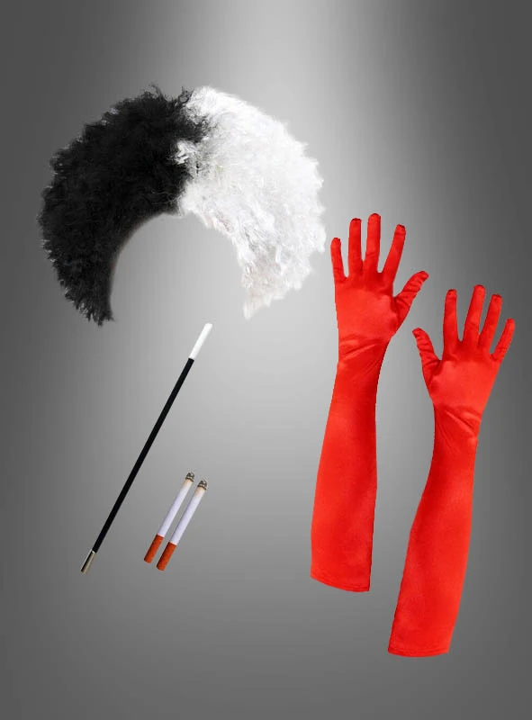Mit diesem tollen Kostümset verwandeln Sie sich in ein böses Cruel Girl und stellen die Modebranche auf den Kopf. Das tolle Set enthält die lockige Perücke, die auf einer Seite schwarz und auf der anderen weiß ist. Mit dabei sind auch die langen, roten Handschuhe und die lange Zigarettenspitze. Das ist ein extravagantes Accessoire Set, welches Sie am besten zu einem langen, schwarzen Kleid tragen können.