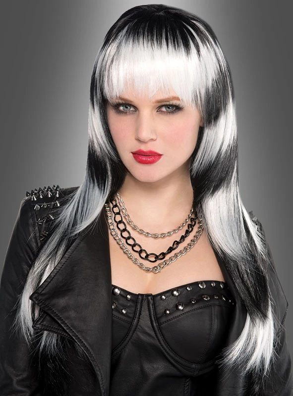 Der glänzende und täuschend echte Haarersatz beeindruckt zweifarbig mit seinem hübschen Farbverlauf in schwarz und weiß. Lange glatte Haarsträhnen fallen bis weit über die Schultern und sind im luftdurchlässigen Haarnetz gut verankert. Dieses verleiht der 80er Jahre Perücke ihren sicheren Halt, ist aber so großzügig gearbeitet, dass Sie Ihre eigenen Haare darunter verstecken können. Der pfiffige Pony kann in der Stirn getragen oder – mit Hilfe von etwas Haarspray – auch zur Seite gekämmt werden.