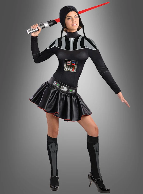 Das Kleid aus dehnbarem Stoff ist schwarz und hat die Rüstungsteile von Darth Vader aufgedruckt. Auf der Rückseite befindet sich ein Reißverschluss. Der angenähte Rock ist aus Satinstoff mit roter Einfassung. Innen ist ein Tüllrock angenäht, der für einen schönen Halt des Rockteils sorgt. Der Gürtel aus Kunstleder ist ebenfalls bedruckt und wird mit einem Klettverschluss befestigt. Die Kniestrümpfe und die Mütze, die den Helm darstellt, sind ebenfalls im Lieferumfang enthalten.
