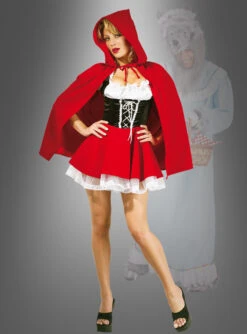 Das DELUXE Rotkäppchen Märchenkostüm: Besteht aus Samtkapuzenumhang, Samtkleid (kurz und sexy) mit Spitzenoberteil und Spitzensaum. Die Miederschnürung sorgt für perfekte Passform. Das Kleid ist sehr kurz. Wir empfehlen deshalb eine Petticoat darunter zu tragen.
