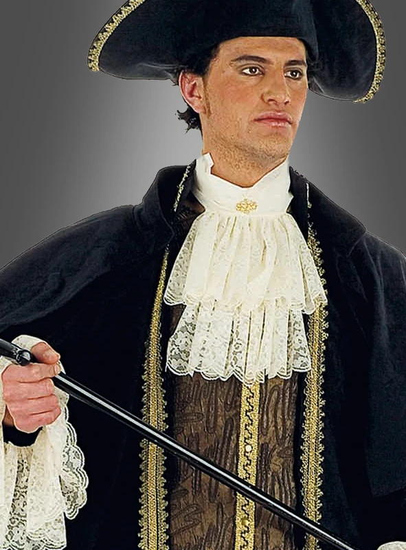 Dieses deluxe Kostüm in Theaterqualität ist wunderschön verarbeitet. Die schwarze Jacke aus samtigem Velours mit Schulterpolstern hat eine dreireihige Verzierung aus goldenen Spitzenborten. Die breiten Ärmelaufschläge sind verstärkt. An den Ärmelabschlüssen ist weißer Spitzenstoff eingenäht. Sehr edel!