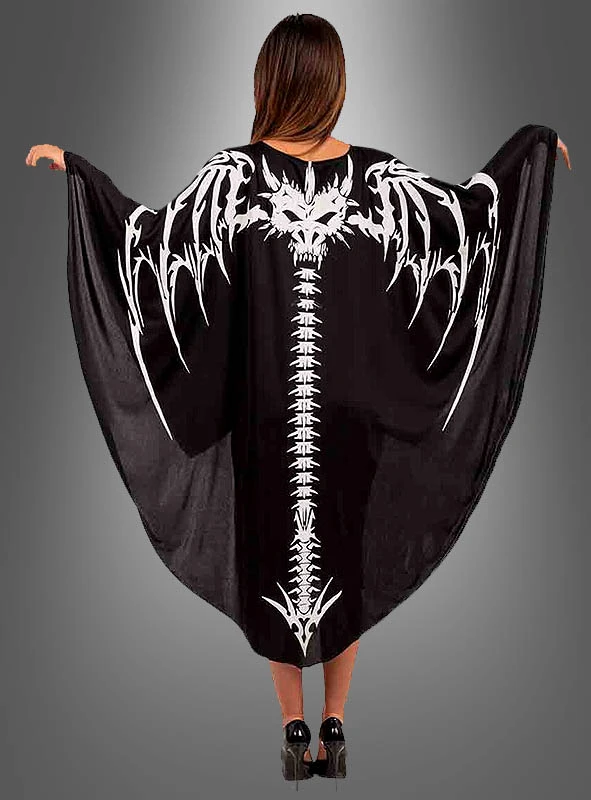 Das wunderschöne Halloween Drachen Skelett Cape ist eine echte Augenweide. Vor allem die Rückenansicht beeindruckt. Hier sind der Drachen Schädel, die lange Wirbelsäule und die großen Drachenflügel Knochen aufgedruckt. Breitet man die Arme aus, so sieht es fast aus, als ob der untote Drache jeden Moment losfliegt. Aber auch die kürzere Vorderseite sieht toll aus. Auch hier sieht man auf beiden Seiten die stilisierten Flügel des Untiers.