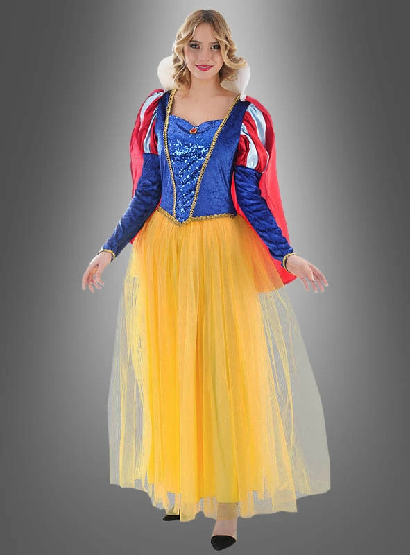 In diesem traumhaft schönen Schneewittchen Kostüm für Damen werden nicht nur Zwerge Ihrem Charme und Ihrer Schönheit verfallen. Das lange Kleid besteht aus einem Oberteil mit Samt und rot-weißen Puffärmeln aus Satin. Verziert ist es mit goldenen Borten und im Brustbereich vorne ist Stoff mit funkelnden Pailletten eingenäht. Zusätzlich verziert ein roter Edelstein den Ausschnitt. Angenäht ist der füllige, lange, gelbe Rock, dessen obere Lage aus feinem Tüll besteht. Im oberen Rückenbereich ist Klettverschluss angebracht. Der hohe weiße Kragen aus Samt ist gepolstert und sieht sehr vornehm aus. An ihm ist der rote Umhang angenäht, der mit Klett am Kleid befestigt wird.