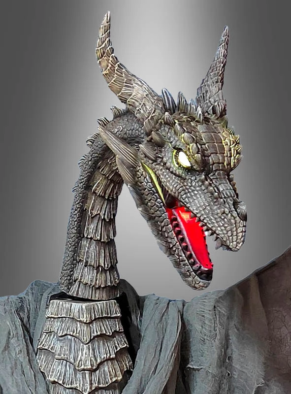 Dieser Drache bewacht sicherlich einen großen Schatz oder eine wunderschöne Prinzessin. Als voll animierte Dekoration eignet sich der Lindwurm perfekt für Halloween, zum Geisterschloss Event oder auch für mittelalterliche oder märchenhafte Themen-Partys. Denn Drachen sind immer beliebt.