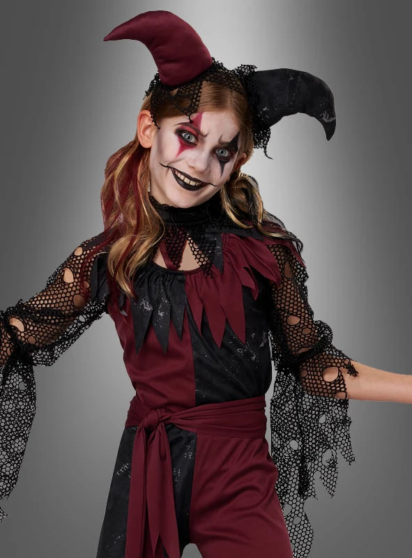 Das Halloween Hofnarr Kostüm für Mädchen ist als Zweiteiler gearbeitet und so besonders bequem und praktisch. Es besteht aus einem schönen Oberteil in Burgund und schwarz. Die dunklen Farben unterstreichen das Halloween Outfit. Dafür sorgen auch die löchrigen Netzärmel mit dem zackig fetzigen Saum. Der Kragen vom Oberteil ist ebenfalls schön zackig geschnitten.