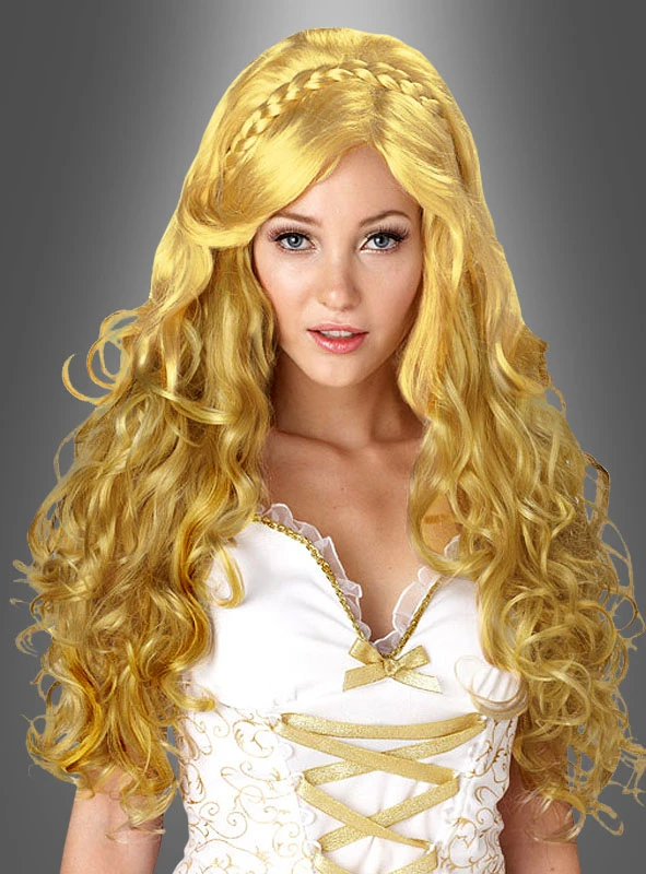 Schöne lange, lockige gold-blonde Perücke mit einem geflochtenem Zopf als Haarband. Besonders schön sind die langen wallenden Locken dieser edlen und voluminösen Perücke.