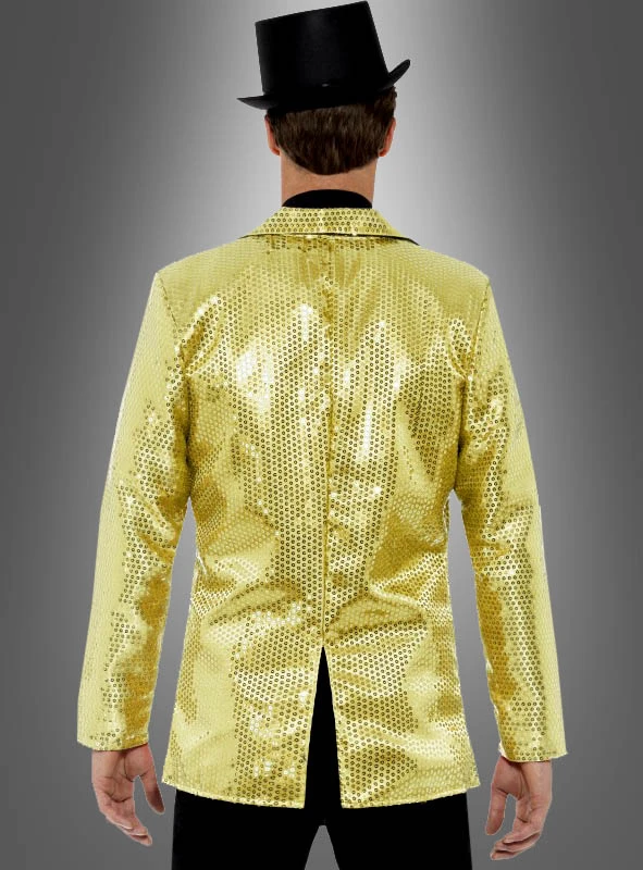 Das Jackett in Gold hat einen Kragen und eine Knopfleiste, mit dem es vorne verschlossen werden kann. Es ist überall mit funkelnden Pailletten versehen die nicht nur aufgebügelt, sondern richtig aufgenäht sind. Die Jackentaschen sind nur Zierde und können nicht benutzt werden. Das goldene Paillettenjackett ist leicht gefüttert und am Kragen verstärkt.