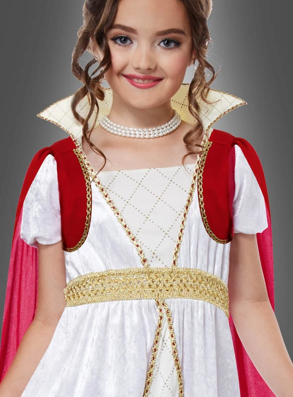 Das rote lange Cape ist ebenfalls im Lieferumfang enthalten, doch Ihre kleine Prinzessin kann selbst entscheiden, ob sie es tragen möchte oder nicht, da es nicht am Kleid befestigt ist. Es wird wie ein kurzes Jäckchen getragen. Die Träger des roten Umhangs sind ebenfalls mit goldener Borte verschönert. Der Stoffgürtel aus goldener Spitze wird mit einem Klettverschluss fixiert. Das goldene Diadem ziert das Haupt der Prinzessin, Königin oder Kaiserin. Mit einem angebrachten Haarkamm kann man die kleine Krone in die Frisur stecken.