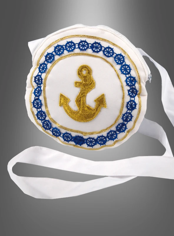 Die weiße Umhängetasche ist mit einem aufgenähten goldenen Anker, sowie blauen Steuerrädern und Goldborte verziert. Sie wird durch einen Reißverschluss verschlossen.