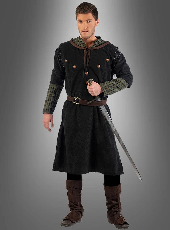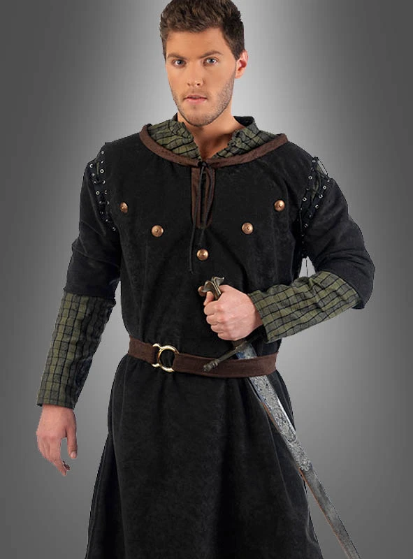 Der mittelalterliche Krieger trägt ein langes weites Gewand in Form einer Tunika. Der schwarze Velourstoff im Wildlederlook gibt diesem Oberteil ein tolles Aussehen. Ärmel und Shirt aus gröberem Webstoff sind eingenäht und sehen optisch wie separate Teile aus. An der Tunika sind Zierknöpfe aus Kunststoff im Metall-Look, Ösen und Schnürungen an den Ärmeln angebracht. Der Schlüsselloch-Ausschnitt ist braun eingefasst und wird geschnürt. An beiden Seiten der langen Tunika sind Keile für mehr Bewegungsfreiheit der Beine eingenäht. Mit dem braunen Gürtel wird die weite Robe tailliert und passt sich so perfekt der Figur an. Der Gürtel wie auch die Stiefelüberzieher sind aus verstärktem Stoff mit Lederprägung hergestellt. Sieht fast wie echtes Leder aus!