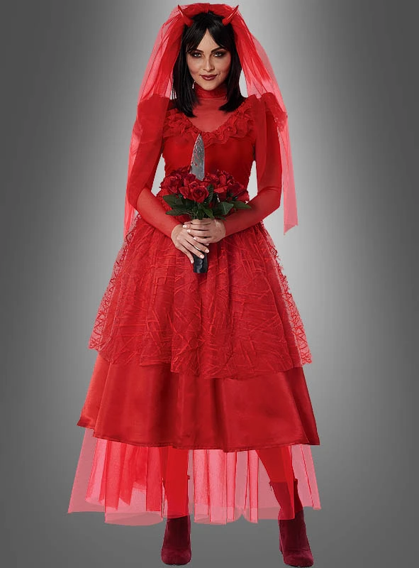 Dies ist keine normale Braut! Sie kommt direkt aus der Hölle. Das Teufelsbraut Kostüm wird Ihnen an Halloween richtig toll stehen. Damit heben Sie sich auf jeden Fall ab von allen schwarzen Vampirinnen und Hexen. Blutrot und wunderschön!