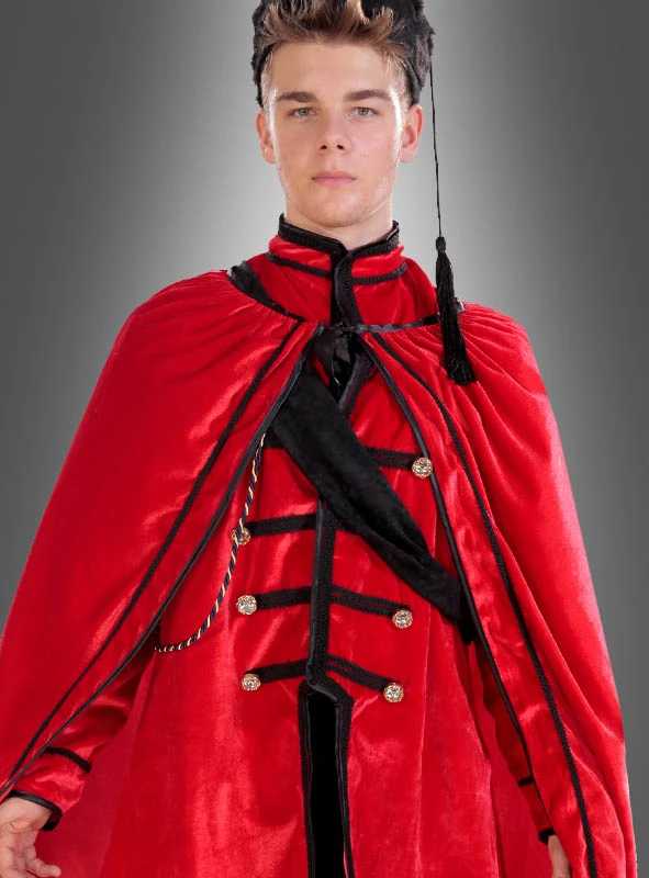 Das Rote Kostüm Russe in deluxe Ausführung besteht aus einer Jacke aus weichem Samt, die mit schwarzen Borten und goldenen Knöpfen verziert ist. Der breite schwarze Gürtel wird darüber getragen. Die schwarze Hose hat einen bequemen Gummizug im Bund und lässt viel Bewegungsfreiheit. Die Stiefelüberzieher werden über den eigenen Schuhen getragen und sind mit goldener Borte und Quasten verziert. Über der Uniform trägt der Kosake einen halblangen Schulterumhang. Dazu natürlich die passende schwarze Mütze. Das Kostüm hat eine ausgesprochen gute Qualität.
