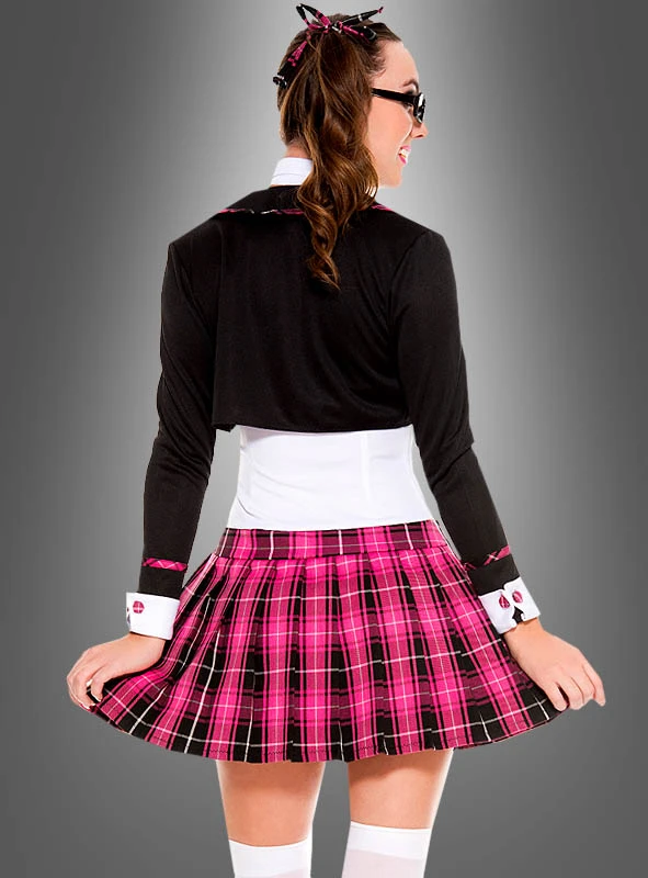 Diese sexy Schuluniform hat eine ganz besondere Ausschnittlösung. Das Neckholder Kleid hat vorne einen sexy Schlüsselloch-Ausschnitt mit angenähter Krawatte. Der karierte Faltenrock in Pink und Schwarz sitzt locker auf den Hüften. Darüber trägt das nicht ganz so unschuldige Schulmädchen eine kurze Bolero Jacke, die weiße Ärmelaufschläge hat. Die Zierborten an den Säumen sind an die Farben des Schottenrocks angepasst. Für die frechen Zöpfe sind noch zwei karierte Schleifen mit im Lieferumfang.