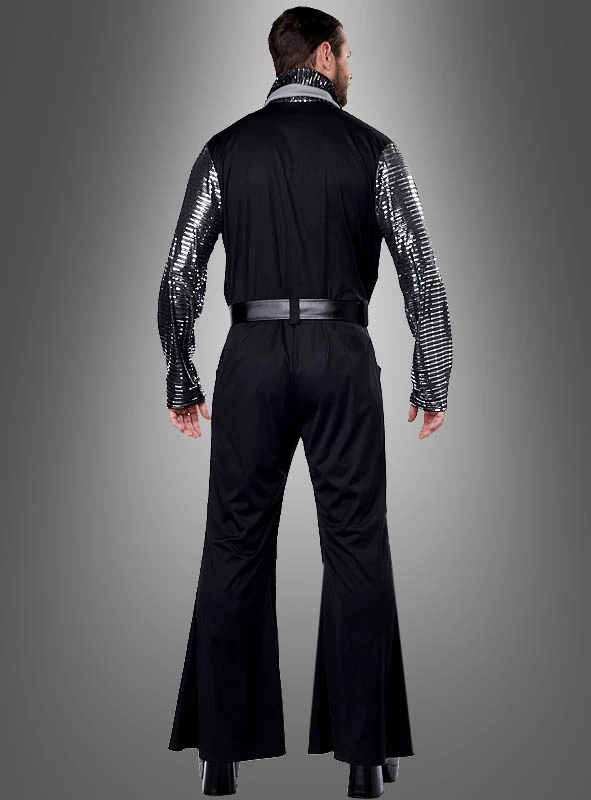 Der bequeme 70er Jahre Overall für Herren ist mit einer tollen Schlaghose ausgestattet. Ein Muss in den Siebzigern! Der Overall ist schwarz und macht eine schlanke Figur. Vorne sind große Knöpfe angebracht, die auch geöffnet werden können. Ein echter Pluspunkt. Die eingesetzten Ärmel und der angenähte große Kragen sind aus funkelndem silber-schwarzem Paillettenstoff gefertigt. Die Pailletten sind ganz besonders angeordnet. Hier wechseln sich runde und quadratische Pailletten ab und bilden ein schönes Muster. So werden Sie mit der Discokugel um die Wette glitzern. Ein toller Effekt!
