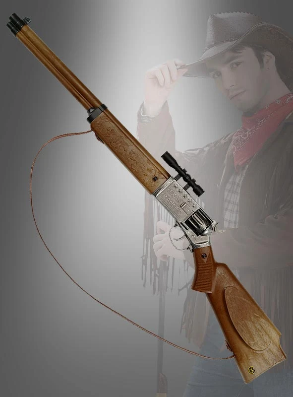 Top Wild West Gewehr Texas Ranger für tolle Cowboykostüme. Wunderschönes Design mit Jagdszenen, Büffel, Bär und Hunden am Lauf. Griff und Lauf sind in Holzoptik gestaltet. 12-Schuss Ringmunition von Wicke verwenden (nicht enthalten). Das Gewehr ist aus stabilem Kunststoff und Zink gefertigt. Zielfernrohr ist abnehmbar. Ein praktischer Tragegurt aus Kunststoff ist am Gewehr befestigt.